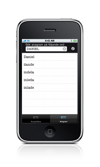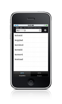 This application can help you with your swedish crosswords. The application contains a list of almost 400 000 SWEDISH words! To search for a word, fill in the letters you know and replace the unknown letters with an asterisk.Example: - If you are looking for a six letter word, where the third letter is K and the forth is O, you type **KO** - If you are looking for a four letter word which begins with an A, you type A*** You can also search for anagrams! I.e. words that can be created by rearranging all letters in a word.